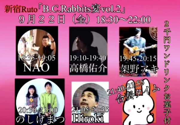 ●2023.9.22(金) 「B.C.Rabbits宴vol.2」 18:30~22:00 @新宿Ruto(最寄り:新宿御苑前駅 or 四谷三丁目駅⇒Vo.響香の体調不良により出演キャンセルさせて頂きました。申し訳ございません。