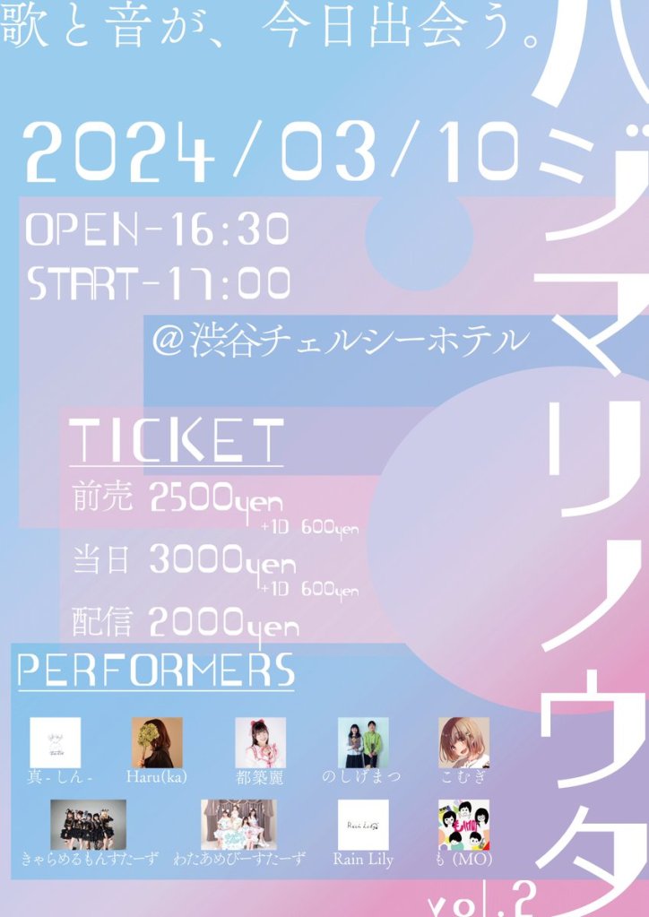 ●2025/3/2日 「ハジマリノウタ vol.3」@渋谷GARRET udagawa Open16:30/Start17:00 ADV¥2,500 DOOR¥3,000 チケットはこちらから