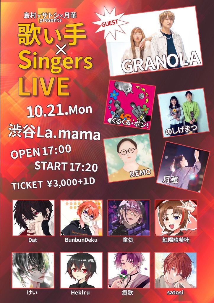 ●10/21月 「歌い手×Singers LIVE」@渋谷La.mama Open : 17:00/Start : 17:20 前売り▶一般¥2,500 、アーティスト応援チケット(メッセージ付)¥3,000、プレミアムチケット(1曲リクエスト権付)¥5,000 学割¥2,000 当日▶¥3,000 ※1drink代がかかります ※のしげまつは19:35〜