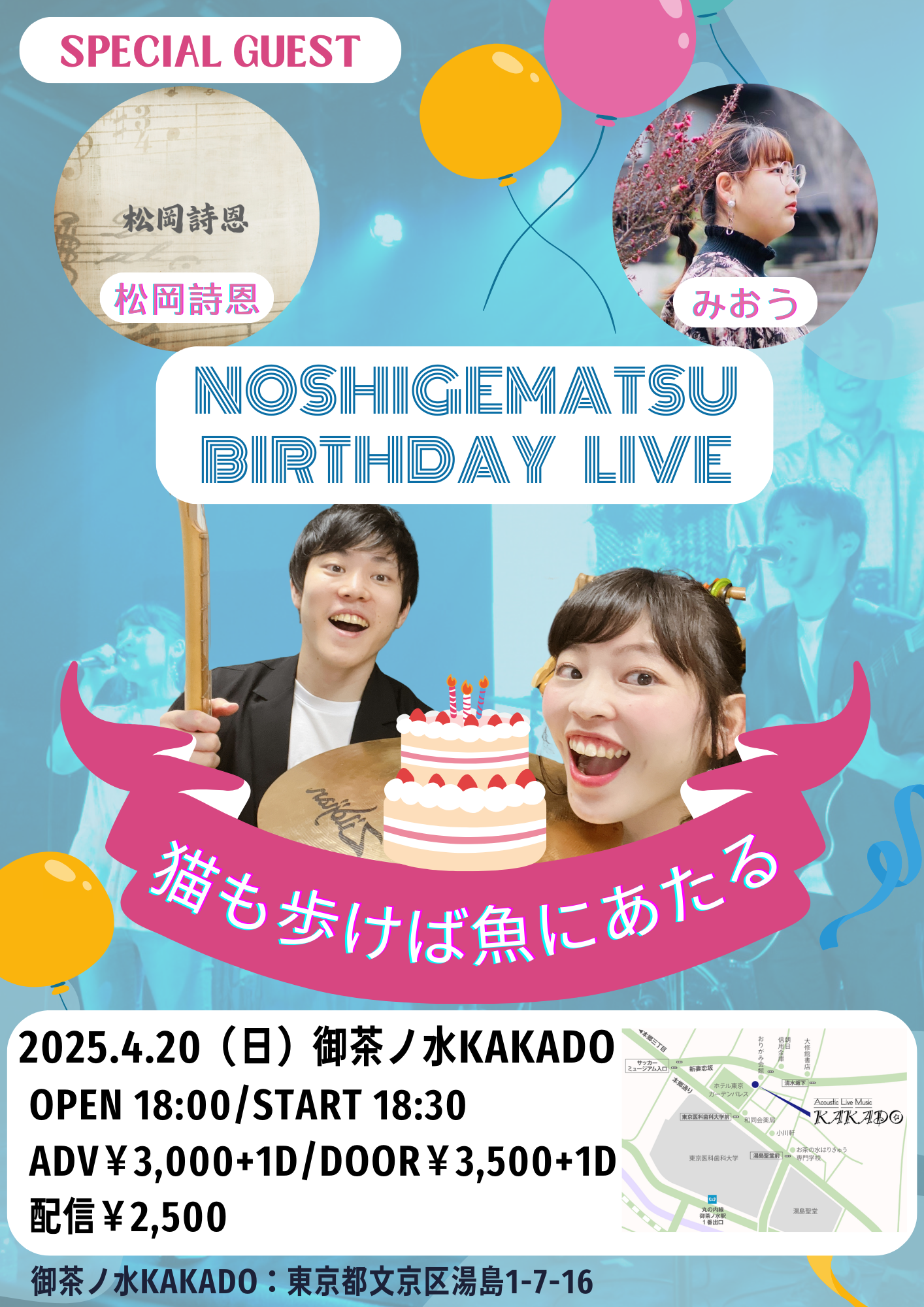 ●2025/4/20日 のしげまつ初のバースデー企画ライブ「猫も歩けば魚にあたる」@御茶ノ水KAKADO Open18:00/Start18:30 ADV¥3,000+1drink/DOOR¥3,500+1drink/配信¥2,500 配信チケットはこちらから