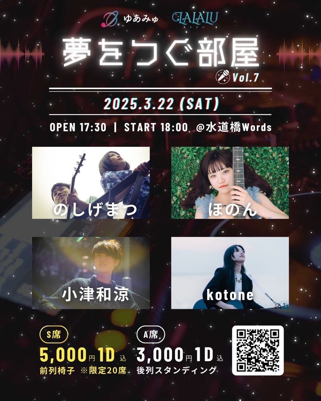 ●2025/3/22土 「夢をつぐ部屋Vol.7」@水道橋Words Open17:30/Start18:00 S席(前列座席)¥5,000+1drink/A席(後列スタンディング)¥3,000+1drink チケットはこちらから