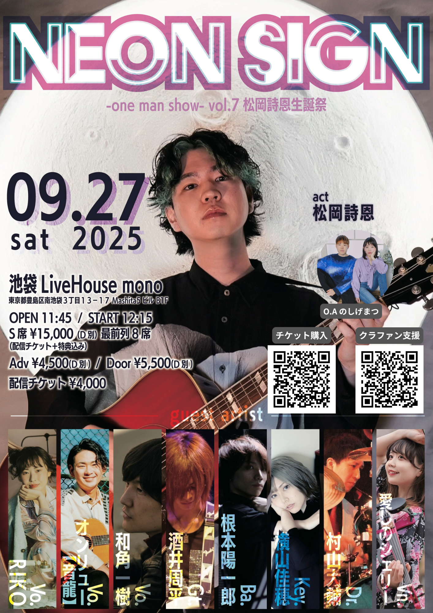●2025/9/27金 松岡誌恩さん生誕祭LIVE「NEON SIGN」O.Aとして出演します!@池袋LiveHouse mono Open 11:45 / Start 12:15 Adv¥4,000+1D S席¥15,000(配信チケット&特典込) 会場チケットはこちらから/配信チケットはこちらから/クラファンはこちらから
