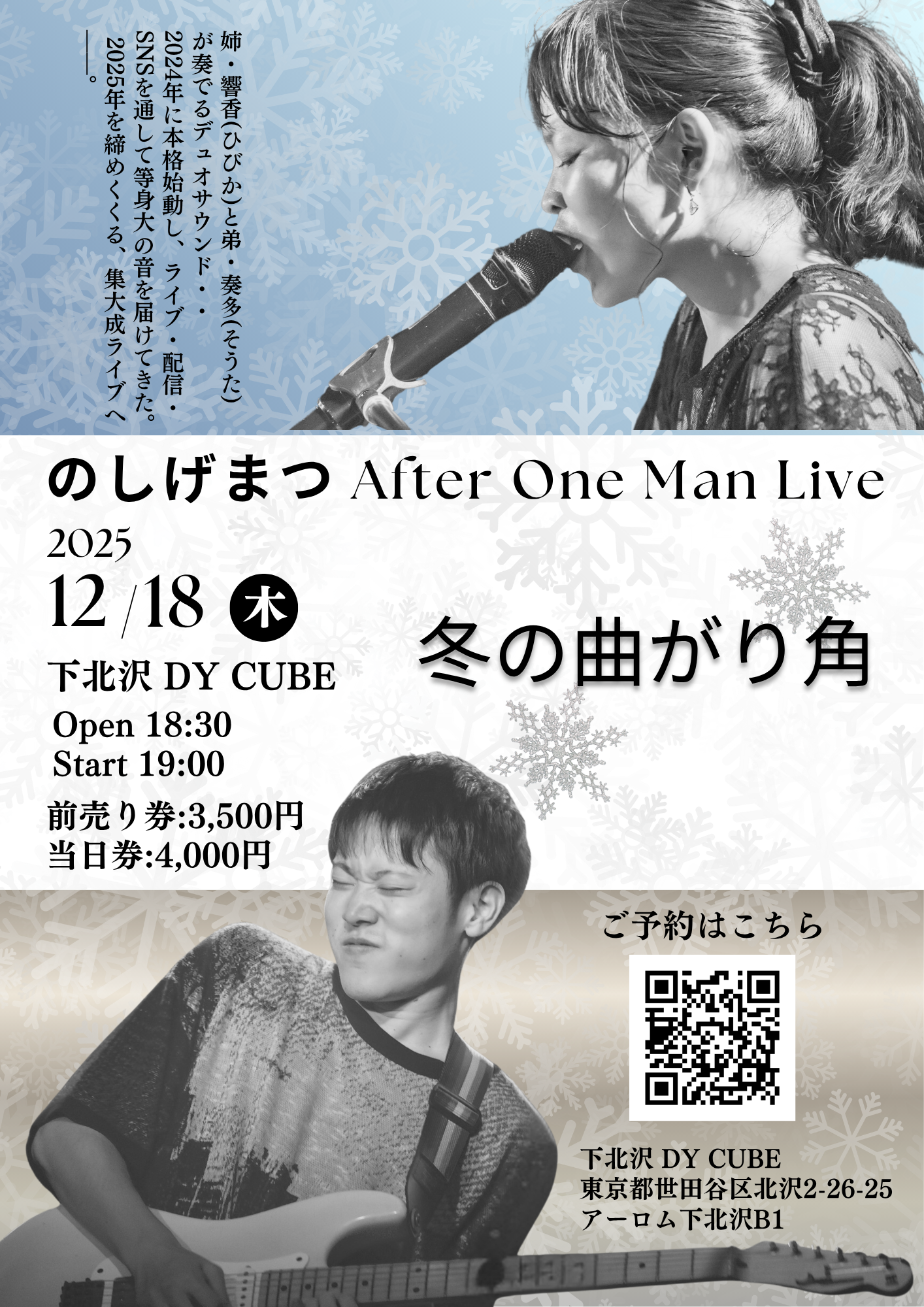 ●2025/12/18木 アフターワンマンライブ「冬の曲がり角」@下北沢DY CUBE Open18:30/Start19:00 料金:前売り券¥3,500 / 当日券¥4,000 ご予約はこちらから